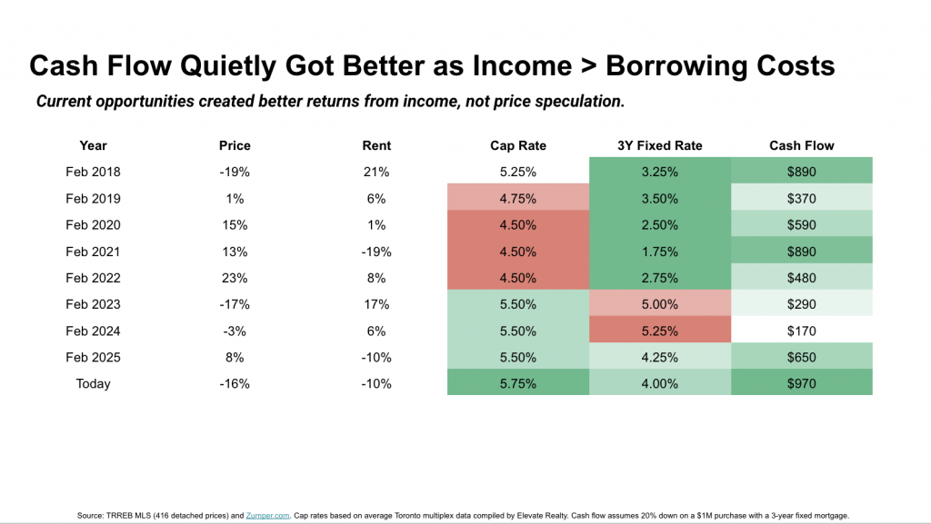 From mid-2024 to today, rents softened slightly, prices drifted lower, and interest rates began to ease. The result was better cash flow, not worse. Today, cash flow on Toronto multiplexes looks stronger than it has in almost a decade.