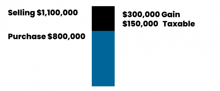 - Taxable capital gain = $150,000 (50% of the $300K). That $150,000 gets added to your income in the year you sell.