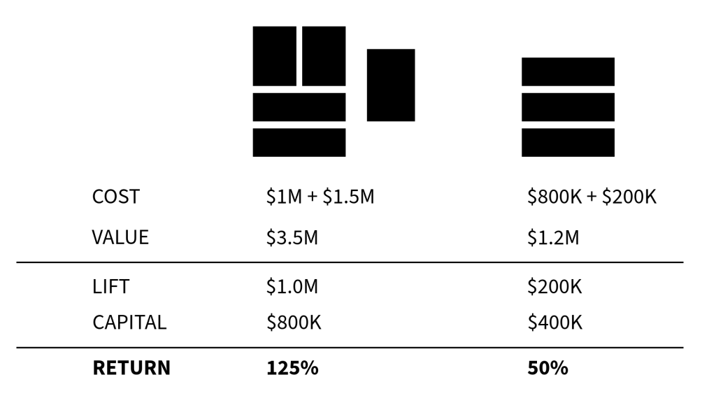 The same logic applies to value creation. A large project might show a $1M value lift on paper, but that assumes perfect execution. Cost overruns quickly reduce that upside. Smaller residential projects can produce similar percentage returns with less time, fewer moving parts, and lower downside risk.