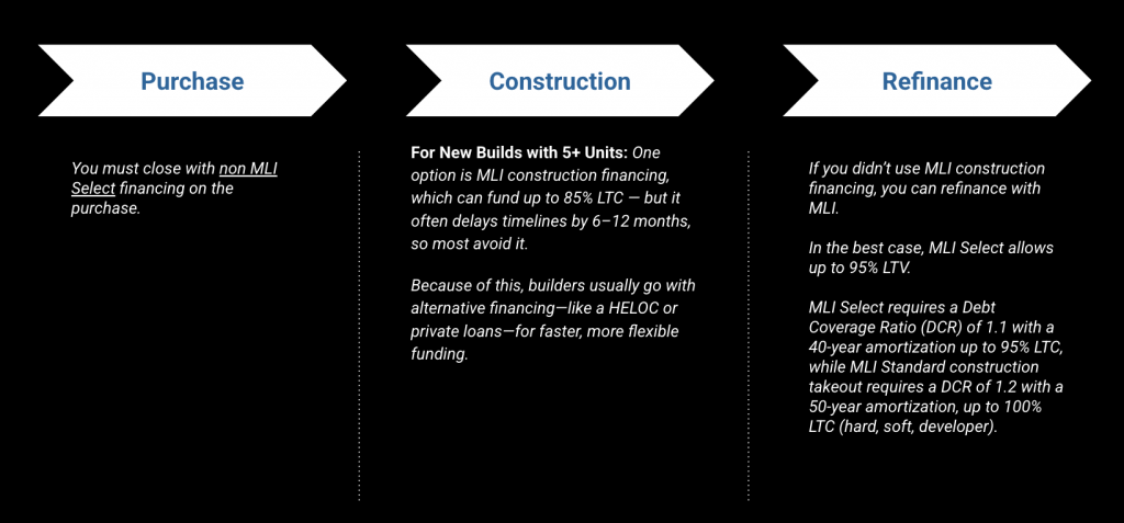 Experience, net worth, and borrower strength matter a lot. In practice, many experienced builders don’t even use CMHC MLI Select construction financing because it can be slow and restrictive. Instead, they build with private or alternative financing and refinance into MLI after the project is complete.