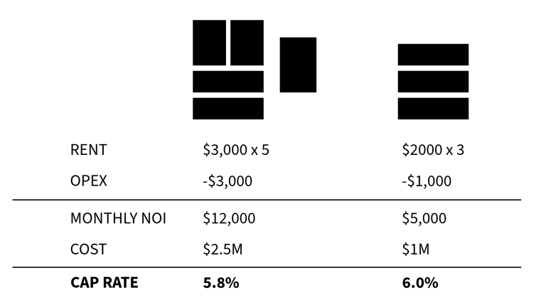 Large projects can look impressive on paper. Five units at $3,000 per month sounds great. But when you stack that against a $2.5M total project cost, the cap rate is often around 5.5 to 6 percent.
