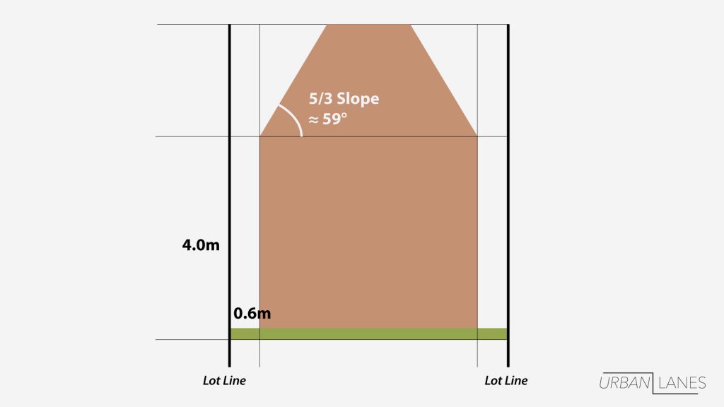 - If your side wall is set back less than 1.5 metres from your minimum required setback: You must follow the sloped roof rule on that side at a maximum angle of 5 vertical to 3 horizontal.