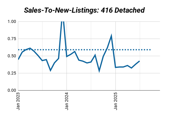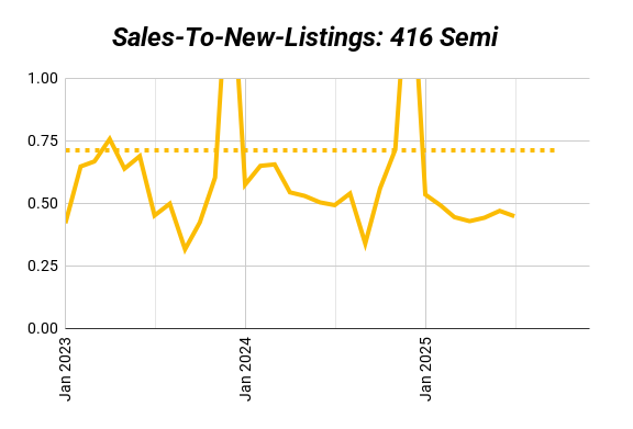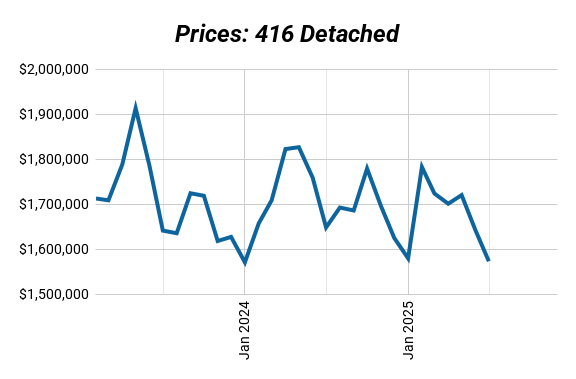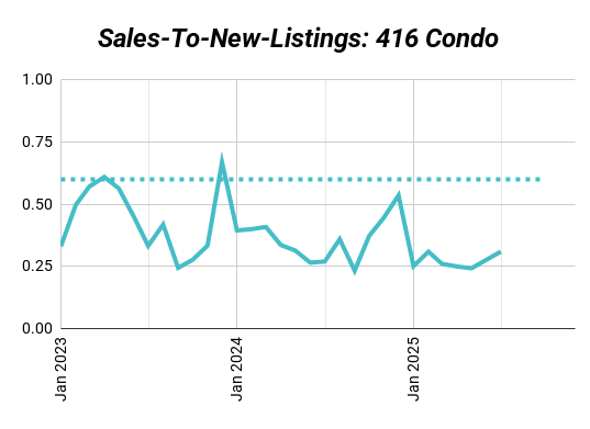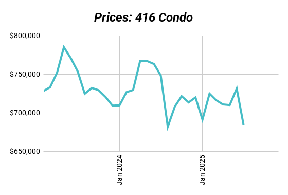 • 416 detached homes are showing signs of bottoming out. Prices are already down 24% from the peak and dropped 4% in the last month. But listings are thinning out, and the SNLR is starting to improve. That’s often how floors form — slow, quiet stability before any big headlines.