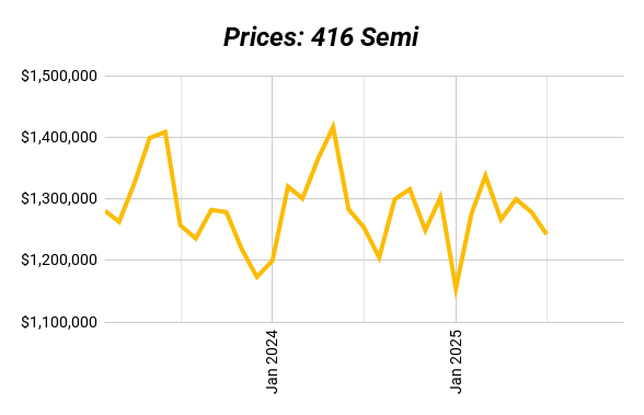 • Semis Are the Most Stable: 416 semis are holding up the best. Prices are down just 1% year-over-year and 3% from last month. Demand is still strong because these are the most affordable “real homes” for end users. People still need to live somewhere — this isn’t a speculator play, it’s end-user driven. That kind of demand is sticky.