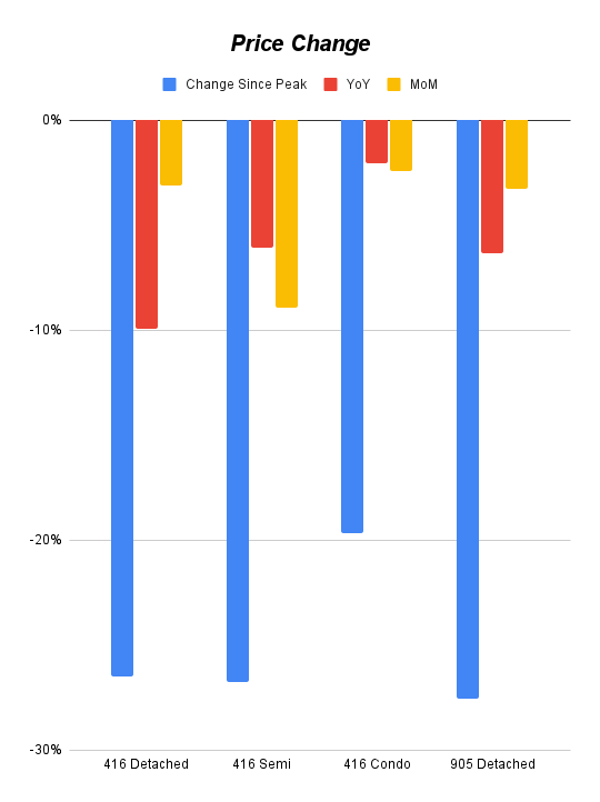 In the suburbs, market conditions for detached homes look a lot like condos. 905 house prices are down the same amount as 416 houses, but demand is thin, and listings move slowly.