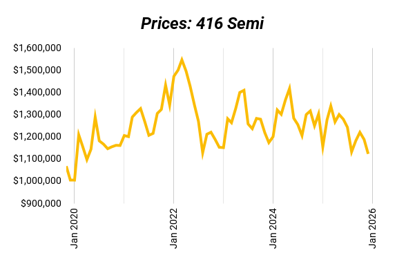 Semis saw sharper movement in December, bringing prices closer to 2022 lows. With very limited holiday inventory, these numbers may overstate the degree of weakness. Given their relative affordability and strong long-term demand, this is a segment worth watching closely as we move into early 2026.
