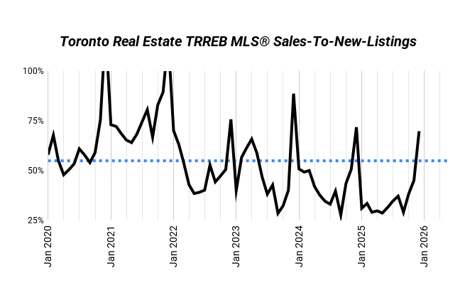 Sales-to-new-listings ratios moved higher in December, but this should be interpreted carefully. With many listings held back during the holidays, SNLR tends to overstate market tightness at year-end. The trend over several months remains more informative than a single December reading.