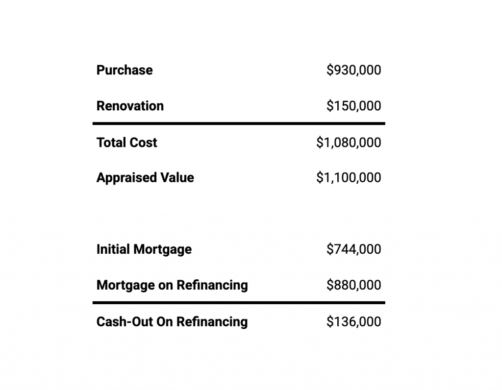 The market has come down from where it was when we bought, so the property is appraising at around $1.1 million. At 80% loan to value that gives us a new mortgage of $880,000. That refinance pulls out roughly $136,000, which essentially gives us our renovation budget back. That is not the home run cash-out we originally projected when we underwrote this deal at higher market values. But that is the reality of where Toronto values are right now, and we would rather show you what actually happened than what we hoped would happen.