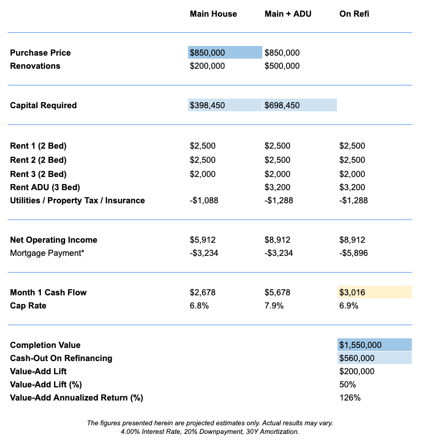 That refinance money can then be used to fund the garden suite. This path has lower upfront capital requirements and spreads out the work. Once the garden suite is built, it could generate ~$3,500/month in extra income.